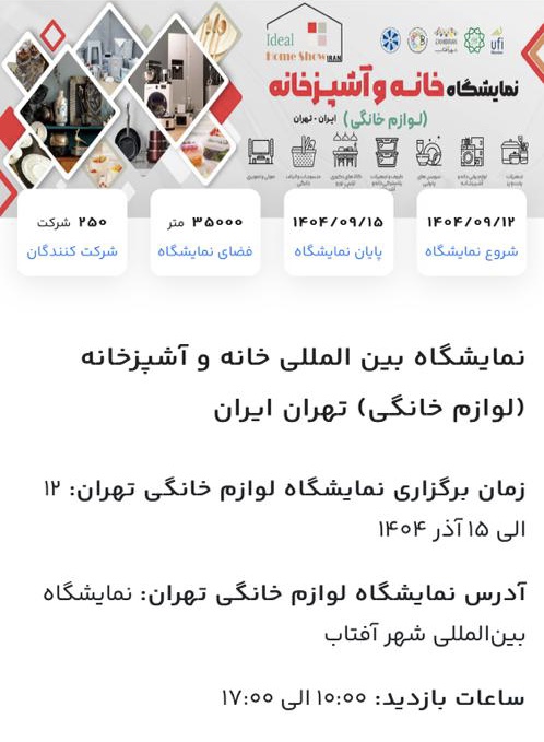 دومین نمایشگاه بین المللی لوازم خانگی ( خانه و آشپزخانه ) از تاریخ ۱۲ الی ۱۵ آذرماه ماه ۱۴۰۴ در سالن های A4,A5, A6 نمایشگاه بین المللی شهر آفتاب بر پا است. عموم افراد و بالاخص تجار و همکاران صنف لوازم خانگی میتوانند از این رویداد مهم و جذاب در